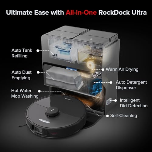 • Upgraded All-in-One RockDock Ultra – The RockDock Ultra revolutionizes cleaning with automatic hot water mop washing (up to 140°F) that effortlessly dissolves stubborn stains from the mop. Its intelligent dirt detection ensures optimal mop-washing time, and returns to heavily soiled areas for thorough cleanliness. Enjoy a fresh environment with automatic hot air drying, which prevents unpleasant odors. The automatic detergent dispenser provides over 3 months of cleaning support with a single fill, while automatic dust collection, water replenishment, and a self-cleaning base ensure hassle-free maintenance, saving you precious time.